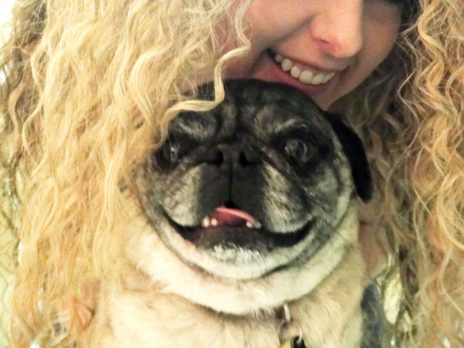 We celebrated my step-dad's 55th birthday this weekend with BBQ and pug dogs, of course. This is Frankie, the street pug, eater of chocolate cakes and entire Costco-sized bags of Hawaiian rolls, and her Emily. |